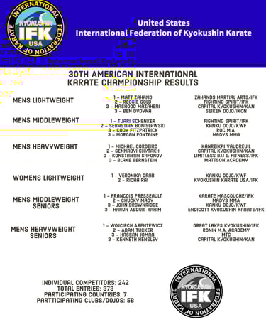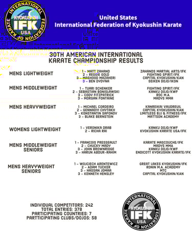 On Saturday, November 12th, 2022, the 30th American International Karate Championships marked its milestone 30th anniversary. Hosted by the USA-IFK Kyokushin organization, the event brought together over 250 competitors and 350 spectators, representing 7 countries and 58 dojos. Participants competed across multiple divisions, including full-contact Kyokushin knockdown kumite, showcasing the power and spirit of traditional Kyokushin Karate.