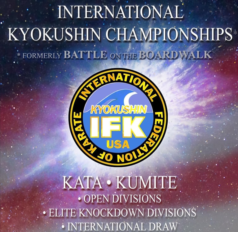 Osu! Mark your calendars for the 4th Annual United States International Kyokushin Championships — taking place on January 28, 2023, at the Tropicana Hotel in Atlantic City, NJ. Formerly known as “Battle On The Boardwalk,” this prestigious USA-IFK event will once again feature divisions in kata for all ages and full knockdown fighting in multiple weight categories.