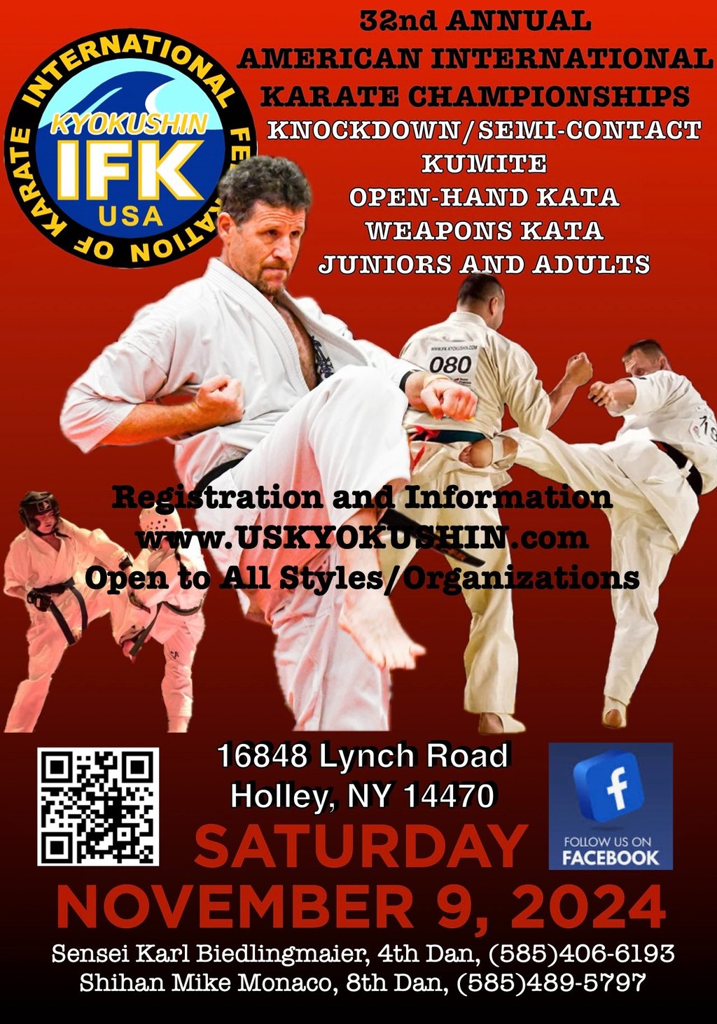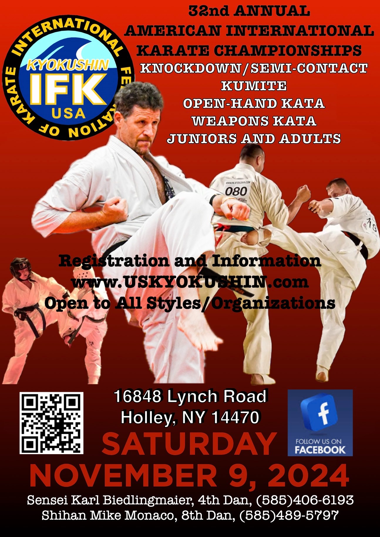 Osu! Registration is now open for the 32nd American International Karate Championships (AIKC), one of the longest-running Kyokushin tournaments in North America. Hosted by USA-IFK President and Country Representative Shihan Mike Monaco (8th Dan), this year’s event will take place on November 9, 2024, in Holley, New York. Known for its intense Knockdown fighting and strong international participation, the AIKC is a must-attend full-contact karate tournament for Kyokushin practitioners across the United States and abroad.