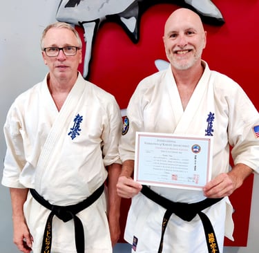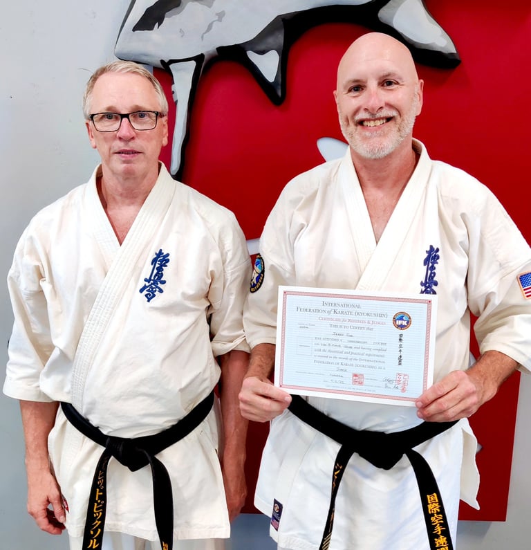 During the 2022 USA-IFK Summer Camp, Shihan Jerry Poe (5th Dan) was formally presented with his IFK International Judging Certification by IFK President Shihan David Pickthall (7th Dan). This year's camp was split between two locations, Gray Wolf Kyokushin in Holley, New York, and Fighting Spirit Karate in Gardiner, New York, with the presentation taking place at Shihan Sean Schenker’s dojo in Gardiner.